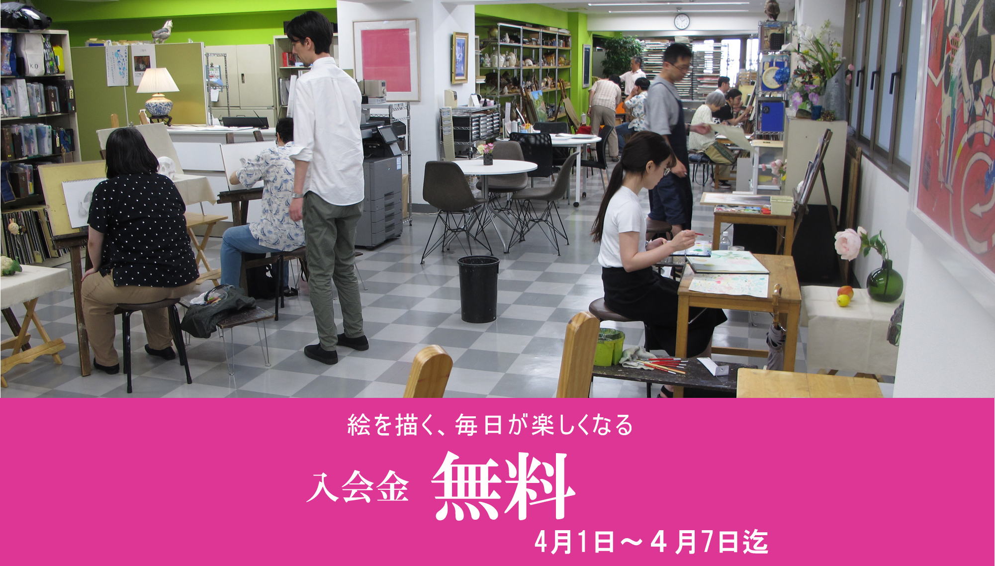 体験レッスンデッサン、水彩、パステル画毎日開催