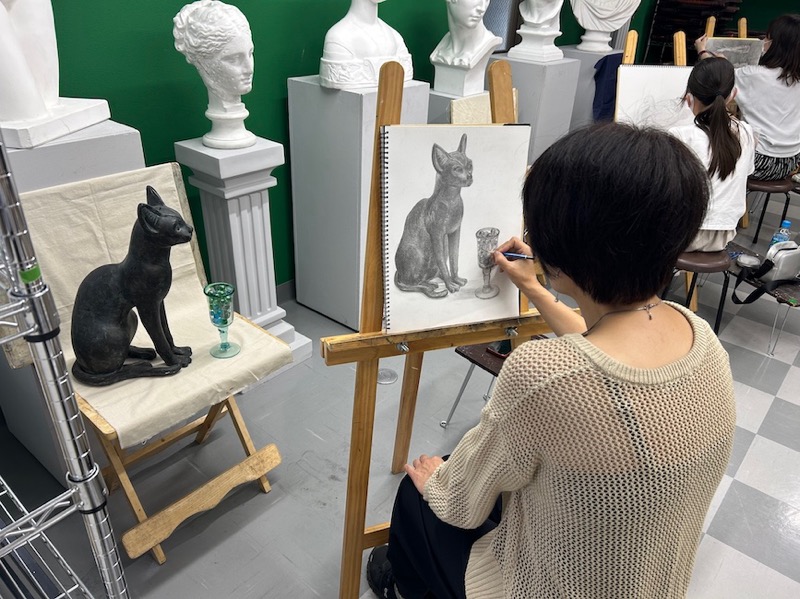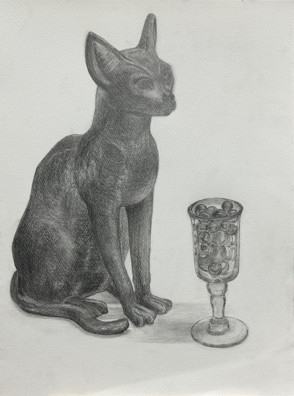 エジプトに伝わる猫の神像(バステト神)と、ガラス玉の入った杯を組み合わせた静物です(両モチーフとも教室所蔵)。モチーフの形態と質感がしっかりと観察されています。