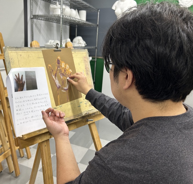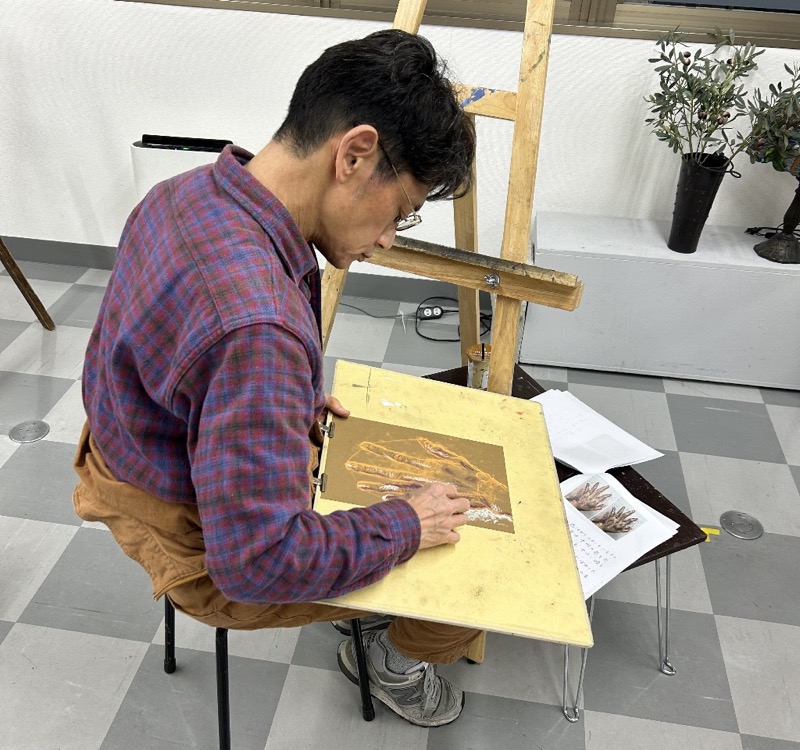 自身の手をよく観察して茶色い紙にコンテで描く企画講習会を月曜日から日曜日迄、