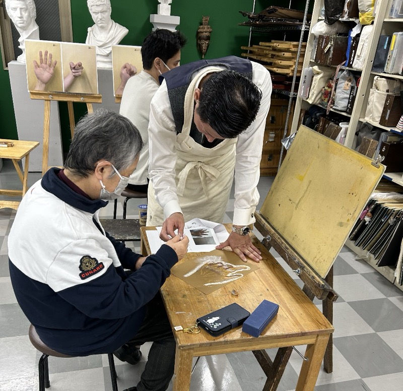 ここが描くポイントのような時には、ご参加会員様に手を止めていただき、集合してもらい必要な