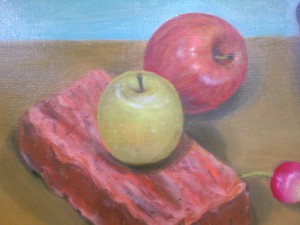 2つの林檎と台の黄土色布がきれいなハーモニーを奏でています。